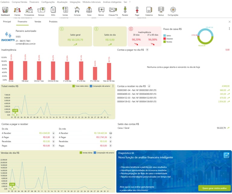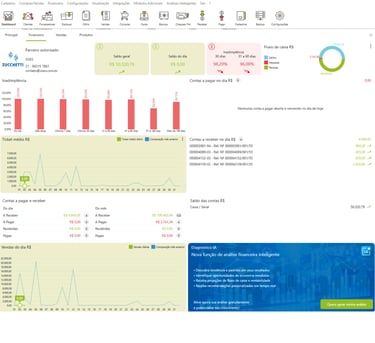 Faça a gestão financeira completa da sua empresa usando uma ferramenta amigável e fácil de usar. Você consegue acompanhar o movimento do caixa em um uma única tela, que mostra também os produtos mais vendidos e os resultados da equipe de vendas.